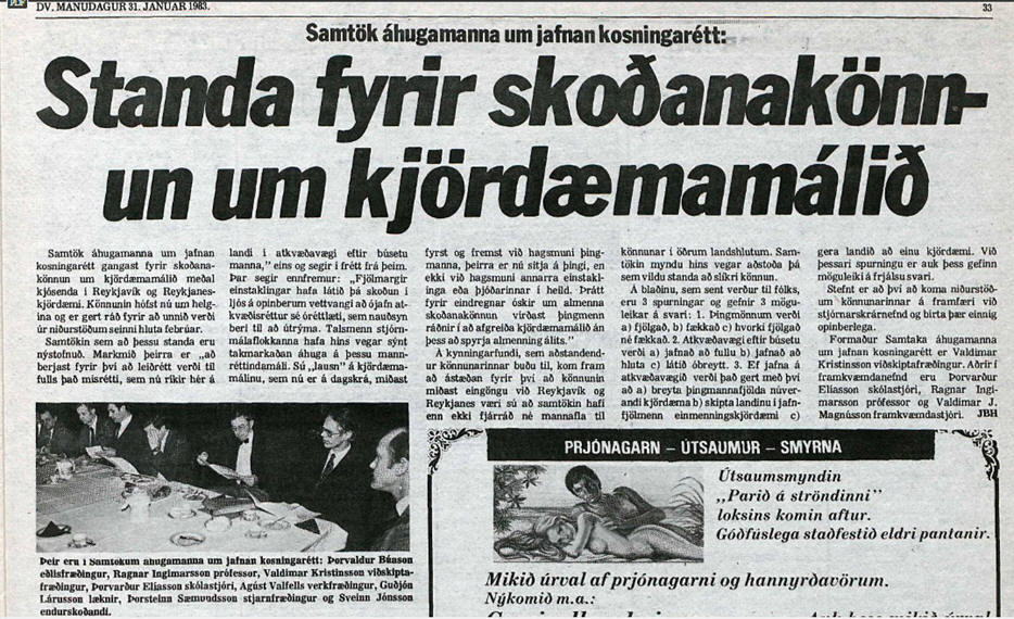 Í hinni er listi yfir fjárhagslega stuðningsaðila. Í Morgunblaðinu 3. febrúar birtist grein eftir Þorvald Búason með fyrirsögninni "Hvað sagði Bjarni Benediktsson um jafnan kosningarétt?" Önnur grein eftir Þorvald birtist í DV 11. febrúar undir fyrirsögninni "Þögn þingmanna og skeytingarleysi". Þriðja grein Þorvalds bar fyrirsögnina "Villandi samanburður". Sú birtist í Morgunblaðinu 23. febrúar. |