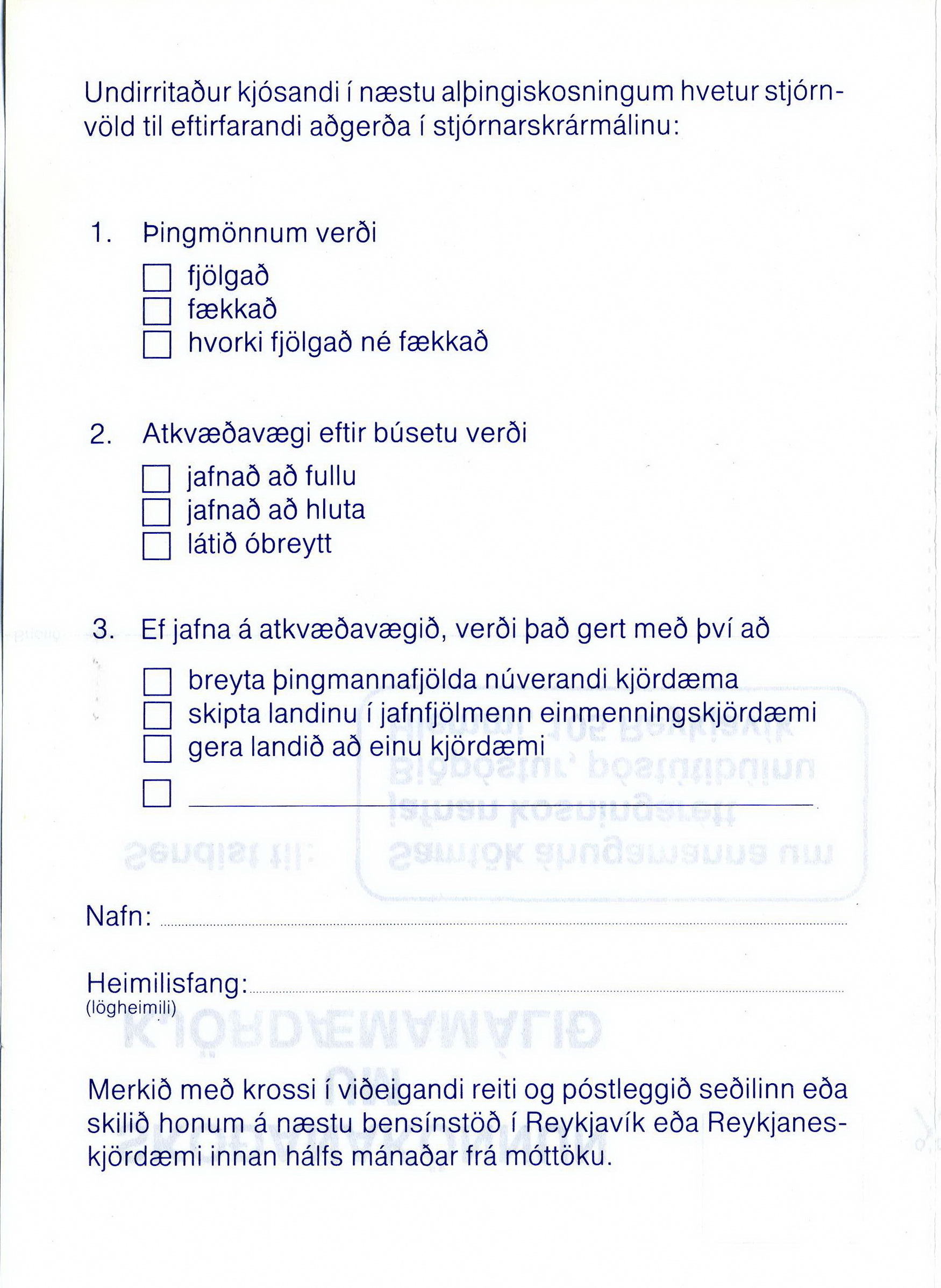 fram frumvarp sitt um breytingar á stjórnarskrá og þar með á kosningalögum.